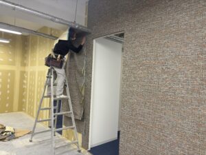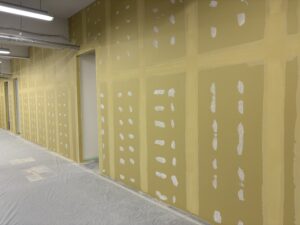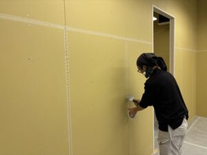工事は仕上げの段階に入りました。 今回のクロスは2パターンの貼り分けで、エントランス側が柄物、その他部屋打ちが珪藻土の白のクロスになります。 クロスの施工は、先日投稿しました下地に目地テープをはるところから始まります。 これは主にひび割れや継ぎ目が分かりにくくするためで、施工精度を上げるために行う工程になります。次にパテと呼ばれる、下地の段差等をなくし滑らかにする作業をします。 継ぎ目の箇所は、2回程度行います。