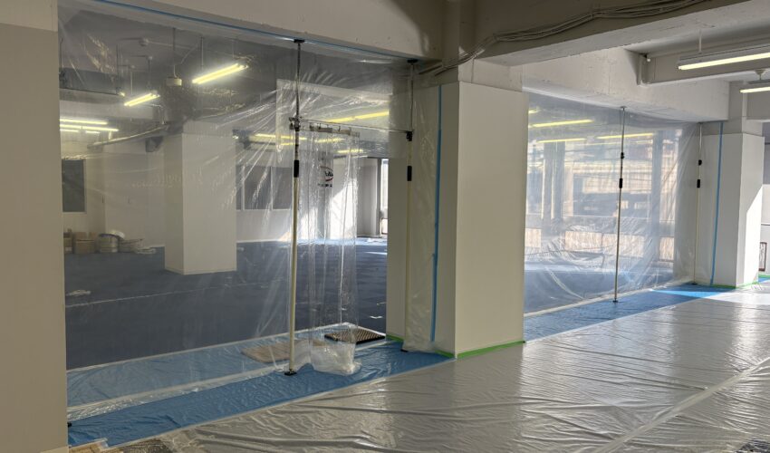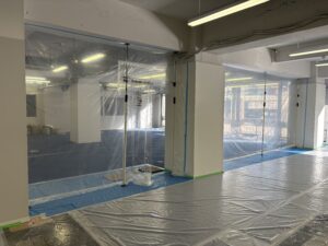 今まであまり載せていない工事前準備(主に養生)になります。 養生とは一般的に、工事で床や壁を汚したり傷つけたりしないようにシート等でカバーすることを指します。 今回は、工事期間中にお客様が一部区画を利用するため、幕養生というものもあります。工事期間中にお客様が出入りする場合は、工事で発生する埃等を事務所に極力入らないようにする必要があります。 もちろん床も汚さないようにマット等完備しないといけません。