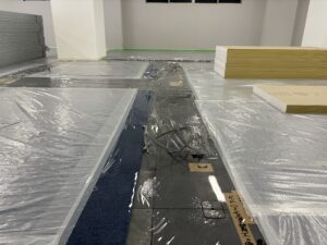 写真の透明部分は壁の建つラインが分かるように透明シートを引いており、養生しても工事に支障がないようにしております。