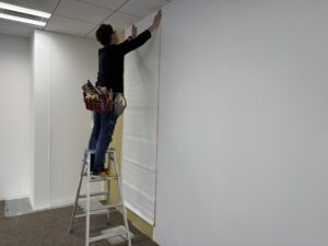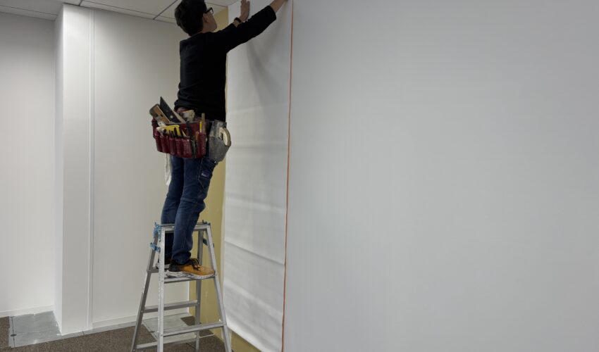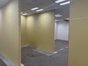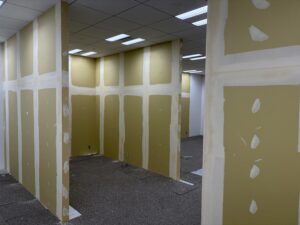 工事はLGS工事で作った壁にクロスを貼る工程になります。 今回はビル側の壁に合わせた白のクロスにしています。 単調ではありますが、今回は建具とガラス間仕切りで木目をアクセントとして採用したので、ビル側の壁の色に合わせました。![]()