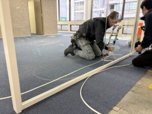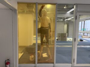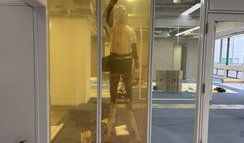 ガラスの間仕切りは解放感があって、オフィスを広く見せる効果があるたオススメです。 また、今回の工事はエレベーターホール側の入り口ガラスフィルムも施工させて頂きました。 少し年季の入ったビルでしたので、少し明るく色味を入れたいとのご要望で、ガラスにカラーフィルムを施工させて頂きました。 採用したのは中川ケミカル様のIROMIZUとよばれるシートになります。 ガラスを清掃し、水を吹きかけて貼っていきます。