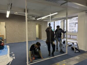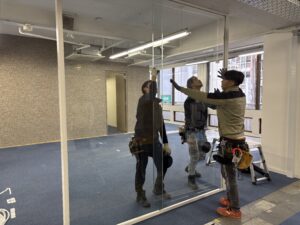 ガラスの間仕切りは解放感があって、オフィスを広く見せる効果があるたオススメです。