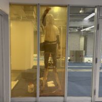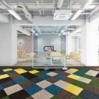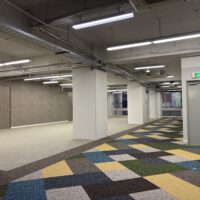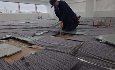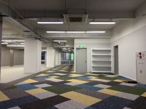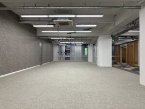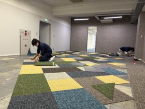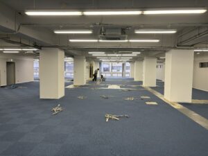 現場は最後の仕上げ工事である床工事の工程になります。 今回は、㈱サンゲツ様にご提案のご協力を頂きました。 まずは施工前の床の写真をご覧ください。よくテナントのデフォルトで見かける光景かと思います。 これがどのように変化していくか最後までこの投稿を見てください(笑) まずは既存カーペット捲り、糊付けをしていきます。 ここで床糊を付けすぎると、粘着性が強い裏がベタベタしたカーペットになってしまうので、要注意です。
