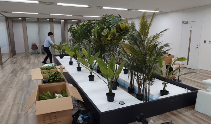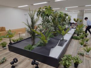 基本は背の高い植物は鉢を設置し、足元の植栽は発砲スチロール等にさして固定していきます。