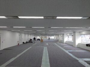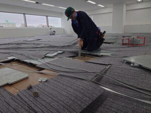 間仕切り工事前の電気配線工事の様子になります。 今回のテナントは、金属のOAフロアを採用しており、床下に懐がある作業しやすいタイプでした。![]()