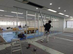 工事はLGS壁工事になります。 LGS壁は、スチール間仕切りと違い、仕上げをクロスや塗装、シートで仕上げる際に採用されます。 スチール間仕切りと違い、温かさや表情等が表れやすい壁になります。 今回の現場はクロスとスチール間仕切りのハイブリッドになります。 使い分けとしては、エントランスの壁面はクロス、その他はスチール間仕切りを採用しました。 ※スチール間仕切りが別日のブログにあげます。 LGS壁はスタッドと呼ばれるアルミ角材に、ボードを貼っていく作業になります。 防音を考えられるのであれば、中にグラスウールを仕込む形で対応させて頂いております。![]()